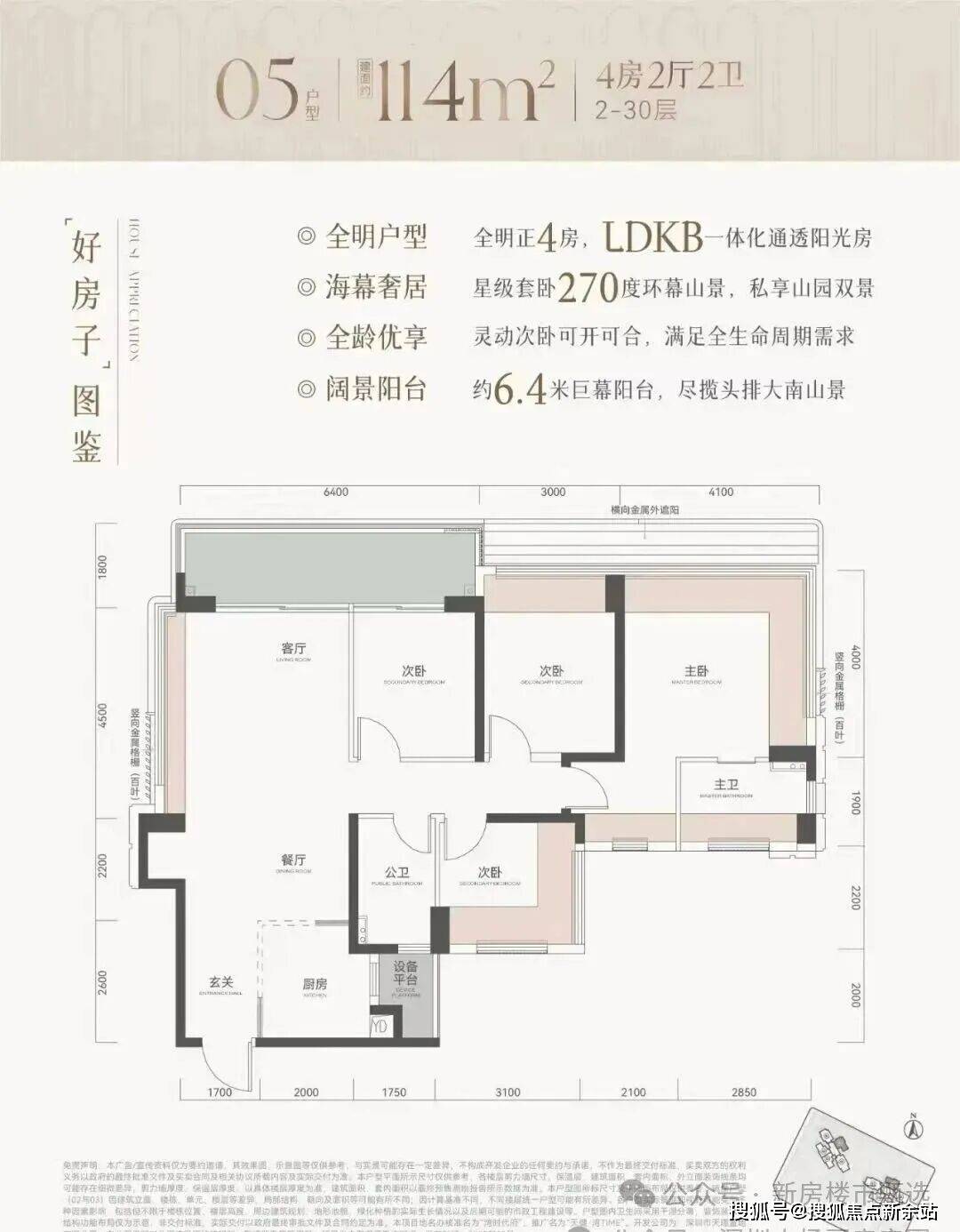 114㎡的4房2厅2卫,设计的是竖厅格局,客厅3.7米开间,LDKB一体化,客厅双面采光,凹墙设计预留冰箱卡槽位,动静分区,分别做到了主卧20.39㎡/次卧12㎡/次卧9.3㎡/次卧8.64㎡(包含墙体飘窗),L型厨房还带1个设备平台约2.86㎡,卫生间干湿分离,得房率约81.4%(不含赠送),客厅连接次卧出6.4米长的大阳台约11.52㎡,东北朝向。 套内面积93.33㎡+飘窗17.25㎡+阳台5.76㎡+设备平台2.86㎡=实得面积119.2㎡,加上赠送后得房率约103.9%。